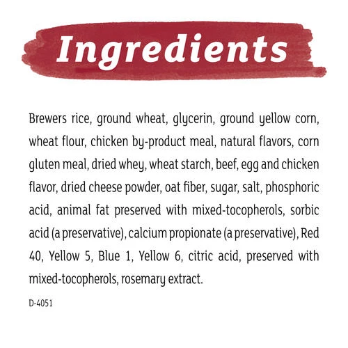 - Ingredients: Brewer’s Rice, Ground Wheat, Glycerin, Ground Yellow Corn, Wheat Flour, Chicken By-Product Meal, Natural Flavors, Corn Gluten Meal, Dried Whey, Wheat Starch, Beef, Egg and Chicken Flavor, Dried Cheese Powder, Oat Fiber, Sugar, Salt, Phosphoric Acid, Animal Fat Preserved with Mixed-Tocopherols, Sorbic Acid (a Preservative), Calcium Propionate (a Preservative), Red 40, Yellow 5, Blue 1, Yellow 6, Citric Acid, Preserved with Mixed Tocopherols, Rosemary Extract. D-4051.