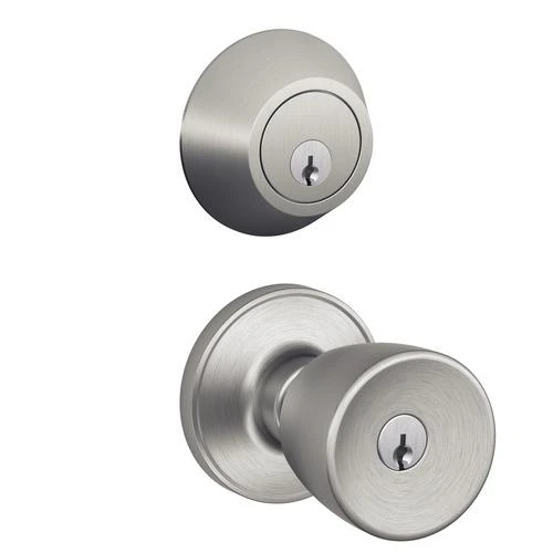 This Dexter® by Schlage® Single Cylinder Deadbolt and Byron Knob Keyed Entry Lock in a satin stainless steel finish is perfect for use on exterior doors and unlocks when the door is opened from the inside, allowing you to leave quickly and conveniently and re-enter easily. The Byron knob offers a look of streamlined simplicity that blends seamlessly across styles, and becomes especially stylish when wrapped in the satin stainless steel finish. Plus, it has been designed and tested with strength and durability in mind.