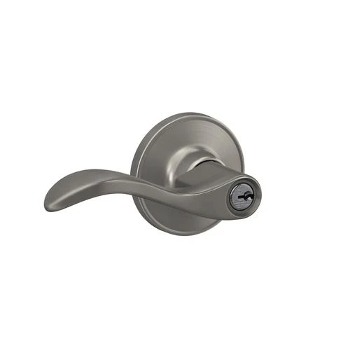 This Dexter® by Schlage® J-Series Seville Lever Keyed Entry Lock in satin nickel locks and unlocks with a key from the outside or with an interior turn button.