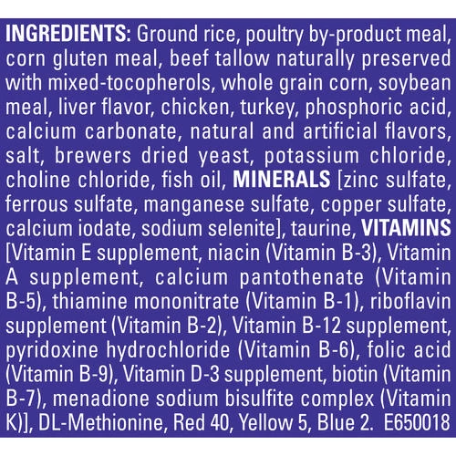 - Ingredients; Brewers Rice, Poultry By-Product Meal, Corn Gluten Meal, Animal Fat Preserved with Mixed-Tocopherols, Ground Yellow Corn, Soybean Meal, Animal Liver Flavor, Chicken, Turkey, Phosphoric Acid, Calcium Carbonate, Natural and Artificial Flavors, Salt, Potassium Chloride, Brewers Dried Yeast, Choline Chloride, DL-Methionine, Added Color, Taurine, Zinc Sulfate, Ferrous Sulfate, Vitamin E Supplement, Manganese Sulfate, Niacin, Red 40, Copper Sulfate, Vitamin A Supplement, Calcium Pantothenate, Thiamine Mononitrate, Yellow 5, Riboflavin Supplement, Vitamin B-12 Supplement, Blue 2, Pyridoxine Hydrochloride, Folic Acid, Vitamin D-3 Supplement, Calcium Iodate, Biotin, Menadione Sodium Bisulfite Complex (Source of Vitamin K Activity), Sodium Selenite. C-6500.