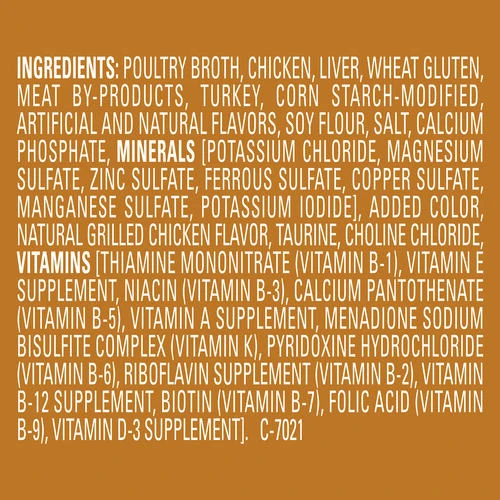 - Ingredients; Poultry Broth, Chicken, Liver, Wheat Gluten, Turkey, Meat By-Products, Corn Starch-Modified, Artificial and Natural Flavors, Added Color, Soy Flour, Salt, Tricalcium Phosphate, Potassium Chloride, Taurine, Choline Chloride, Mono and Dicalcium Phosphate, Thiamine Mononitrate, Vitamin E Supplement, Zinc Sulfate, Ferrous Sulfate, Niacin, Calcium Pantothenate, Vitamin A Supplement, Copper Sulfate, Menadione Sodium Bisulfite Complex (Source of Vitamin K Activity), Manganese Sulfate, Pyridoxine Hydrochloride, Riboflavin Supplement, Vitamin B-12 Supplement, Biotin, Folic Acid, Vitamin D-3 Supplement, Potassium Iodide. B-6941.
