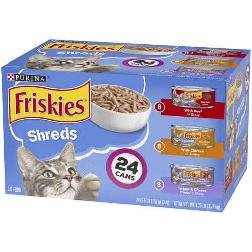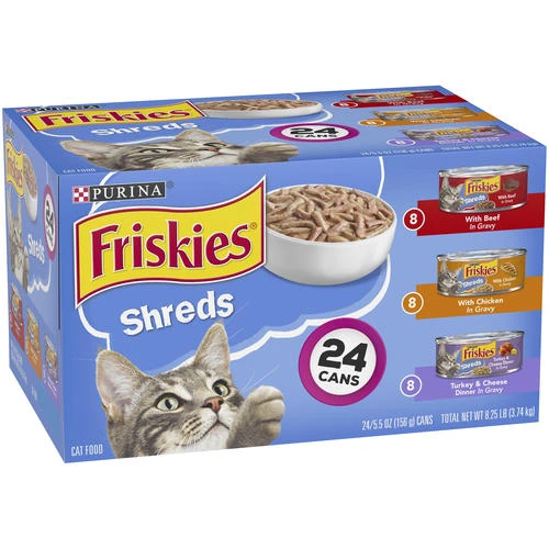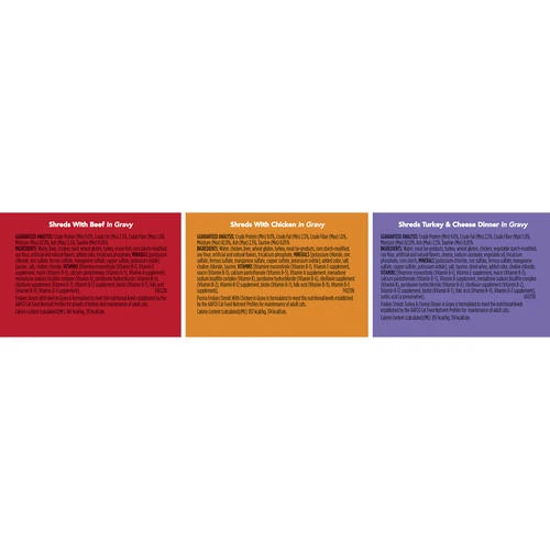 Includes 8 cans of Shreds with Beef in Gravy, 8 cans of Shreds with Chicken in Gravy and 8 cans of Shreds Turkey & Cheese Dinner in Gravy