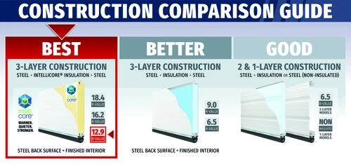 - Best construction with 1-3/8″ Intellicore® Insulation, R-Value 12.9 – Warmer. Quieter. Stronger.