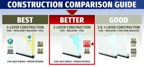 Designer Steel Panel garage doors feature versatile grooved panel designs and window options to give your home a stylish look. This Better construction garage door includes 2″ thick insulation (R-Value 9.0) sandwiched between two steel skins that provides a durable insulating core. The three-layer construction provides strength, dent resistance, insulation and security, as well as quiet operation and a beautiful appearance inside and out.