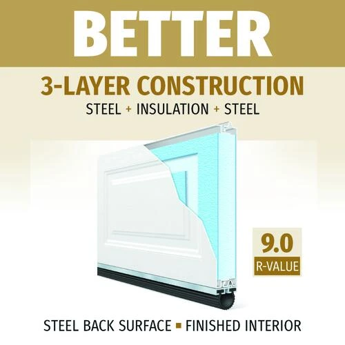 Traditional Steel Panel garage doors feature a design that works with every home without sacrificing style for strength, durability and comfort. This Better construction garage door includes 2″ thick insulation (R-Value 9.0) sandwiched between two steel skins that provides a durable insulating core. The three-layer construction provides strength, dent resistance, insulation and security, as well as quiet operation and a beautiful appearance inside and out.