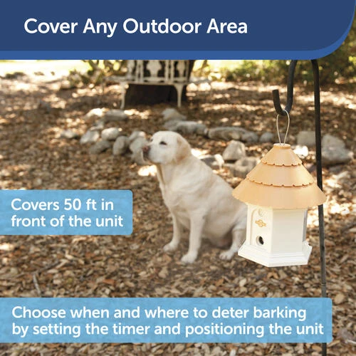 - Disguised as a birdhouse, the unit emits an ultrasonic tone when your dog barks that can be annoying to your dog but is silent to most humans