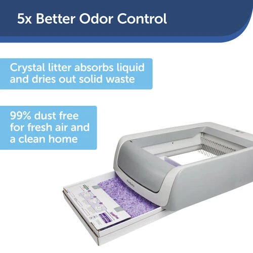 - Removes Odors Quickly: Crystal litter absorbs urine and dries solid waste to quickly remove odors 5 times faster than clumping clay litter; lightly scented with lavender