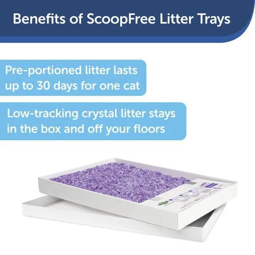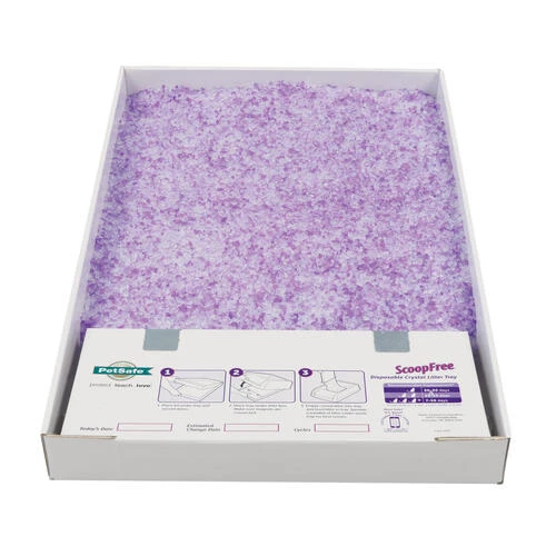 Each ScoopFree® disposable Crystal Litter Tray is pre-filled with lightly scented lavender crystal litter, so all you have to do is load the tray in the litter box with no scooping, cleaning or refilling for weeks! These trays reduce mess in your home with a plastic lining to fight leaks, and with low-tracking crystals that stick inside the box instead of on your cat?s paws. Crystal litter absorbs urine and dries solid waste to quickly remove odors 5 times faster than clumping clay litter. When it?s time to clean up, just remove the disposable litter tray and throw it away. It doesn?t get much easier than that! These replacement trays are compatible with ScoopFree® self-cleaning cat litter boxes. Your pet deserves the best. Trust PetSafe® to help keep your pet healthy, safe and happy.
