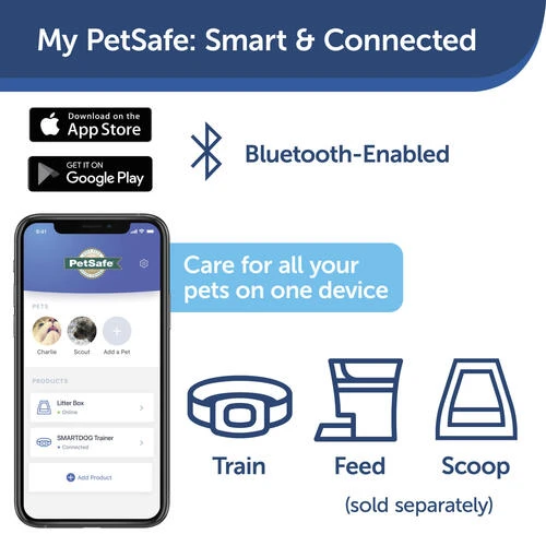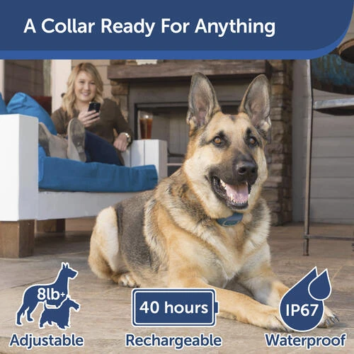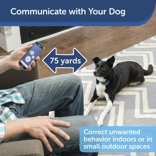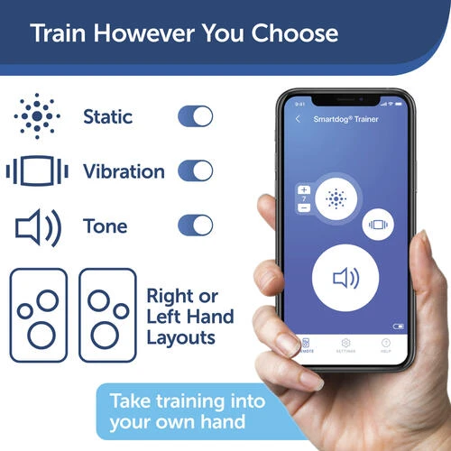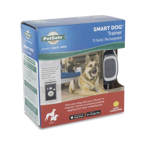 Train your dog using the SMART DOG Trainer collar paired with an application on your smartphone!á Use tone (beep), vibration and static stimulation to reinforce commands and stop unwanted behaviors. The rechargeable, waterproof collar uses the Bluetooth signal from your phone and transmits a signal up to 75 yards away.á The SMART DOG Trainer is compatible with iOS 8 or later and Android 5 or later.