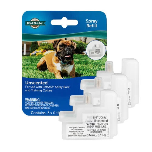 The PetSafe® Unscented Spray Refill Cartridges are easy to replace with no mess. Simply remove the empty cartridge and replace with the new one. The unscented refill cartridges are great for sensitive dogs – a small spray to the snout without added scented oils or fragrances. The PetSafe® refill cartridge is 100% recyclable and safe for you and your dog!