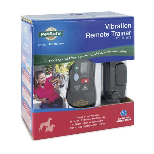The PetSafe® Vibration Remote Trainer is a safe, effective way to teach your dog basic obedience and encourage better behavior. Communicate with your dog without a leash from up to 100 yards away with the push of a button. Use the handheld remote with a digital display to choose from 16 levels of vibration stimulation or tone-only mode. The vibration pattern is especially effective for dogs who are hard of hearing or deaf. PetSafe® brand is here to help you and your pet live happy together™.