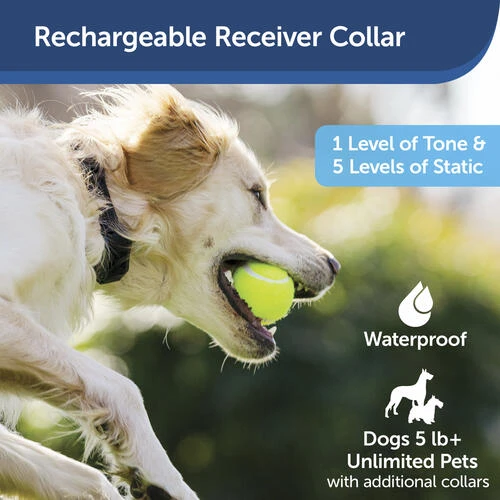 Give your pet the freedom he or she deserves with the PetSafe® YardMax® Cordless In-Ground Fence™. This innovative in-ground containment system features a waterproof transmitter powered by ten D-cell batteries (not included). Perfect for renters, campers, or cabin locations, the YardMax® Cordless Transmitter eliminates the need to drill holes in your home’s exterior. The battery-powered transmitter helps keep your dog or cat safe even during power outages. The rechargeable YardMax® Cordless Receiver Collar works for most cats and dogs weighing five pounds or more and with a neck size measuring 6 to 28 inches. The rechargeable collar lasts up to three months on a single charge and recharges in just two to three hours. With just a few short training sessions, you’ll create a secure boundary for your pets to enjoy the outdoors like never before.