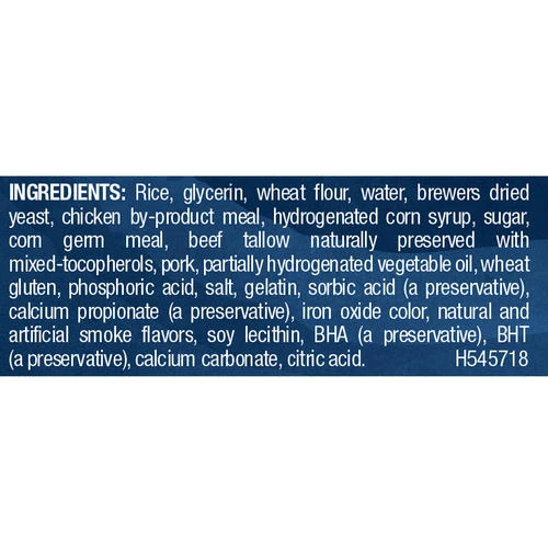 - Ingredients: Rice, Glycerin, Wheat Flour, Water, Brewers Dried Yeast, Poultry By-Product Meal, Hydrogenated Corn Syrup, Sugar, Corn Germ Meal, Animal Fat Preserved with Mixed-Tocopherols, Pork, Partially Hydrogenated Vegetable Oil, Wheat Gluten, Phosphoric Acid, Added Color, Salt, Gelatin, Sorbic Acid (a Preservative), Natural and Artificial Flavors, Red 40, Yellow 5, BHA (a Preservative), BHT (a Preservative), Calcium Carbonate, Blue 1, Yellow 6, Citric Acid. G-5457.