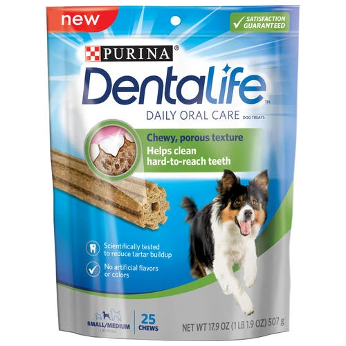 DentaLife Daily Oral Care dog dental chew treats are designed with an innovative porous, yet chewy, texture that contains thousands of air pockets. The unique shape features 8 distinct ridges that clean your dog?s teeth down to the gum line. DentaLife gets dogs chewing to clean even the hard-to-reach teeth in the back of the mouth. It?s how DentaLife is able to deliver a breakthrough clean that?s scientifically proven to reduce tartar build-up. Throw in wholesome ingredients and a tasty chicken flavor for your furry friend and it?s no wonder each pack of DentaLife also comes with a satisfaction guarantee. For clean teeth throughout a long, healthy life together, choose DentaLife. For Life.