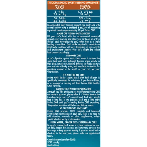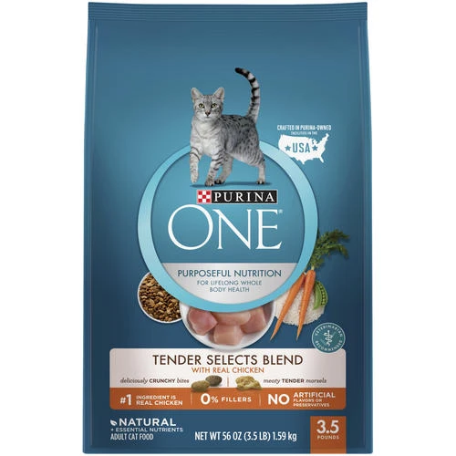 Purina ONE Tender Selects Blend With Real Chicken is a deliciously meaty blend of protein-rich, crunchy and tender bites that will satisfy your cat and promote lifelong whole body health.