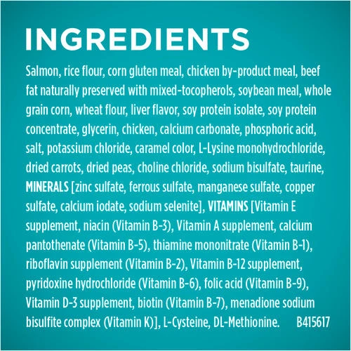 - Salmon, Brewers Rice, Corn Gluten Meal, Poultry By-Product Meal, Wheat Flour, Soybean Meal, Animal Fat Preserved with Mixed-Tocopherols, Whole Grain Corn, Animal Liver Flavor, Soy Protein Isolate, Soy Protein Concentrate, Fish Meal, Glycerin, Chicken, Pho