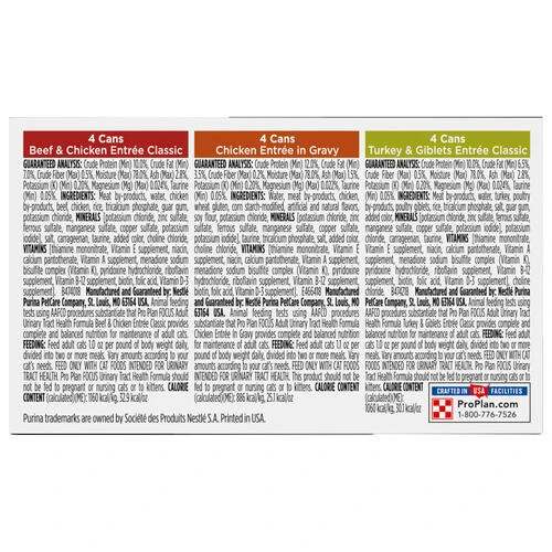 Pro Plan Focus Urinary Tract Health Formulas – Beef & Chicken Entree Classic, Chicken Entree in. Gravy and Turkey & Giblets Entree Classic – are specially designed to help maintain your cat’s urinary health by reducing urinary pH and providing low dietary magnesium. This formula is made with real meat, and an excellent taste. Every cat is special and you want the best for her. with over 50 formulas, Purina Pro Plan can help you find our best cat food to meet your cat’s unique needs.