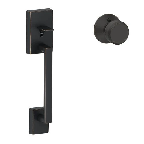 The Schlage® Century Lower Half Handleset and Bowery Knob in Aged Bronze is perfect for use with an electronic deadbolt for a complete front entry set. The Bowery knobs clean lines and minimalist design give it a futuristic look that is as modern as it is stylish. The Aged Bronze finish is inspired by traditional design, featuring warm, copper tones that break through its darker, aged exterior. Plus, its been designed and tested with strength and durability in mind.